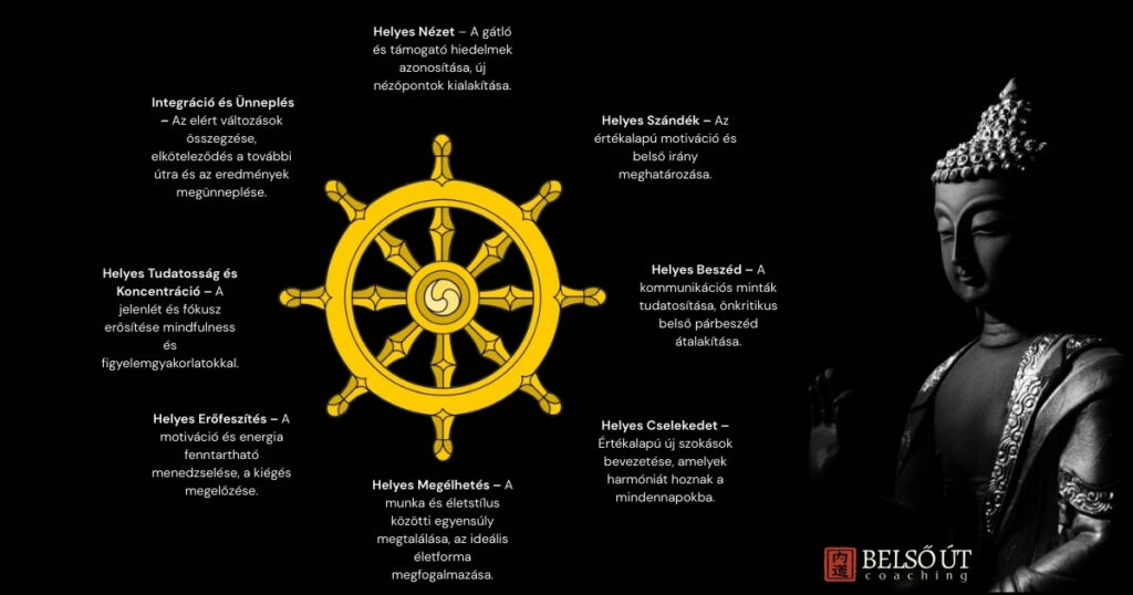 Ezek a tanítások közvetlenül kapcsolódnak a Belső út coaching gyakorlathoz. A folyamat során először azonosítjuk a belső akadályokat és szenvedéseket (1. és 2. Igazság), majd tudatosítjuk a változás lehetőségét (3. Nemes Igazság), végül konkrét, gyakorlatias lépéseket teszünk (4. Nemes Igazság és Nyolcrétű Ösvény). Így Buddha tanításai nem csupán filozófiai keretet adnak, hanem gyakorlati útmutatóként szolgálnak, lehetővé téve az egyének számára, hogy mély belső átalakuláson menjenek keresztül.